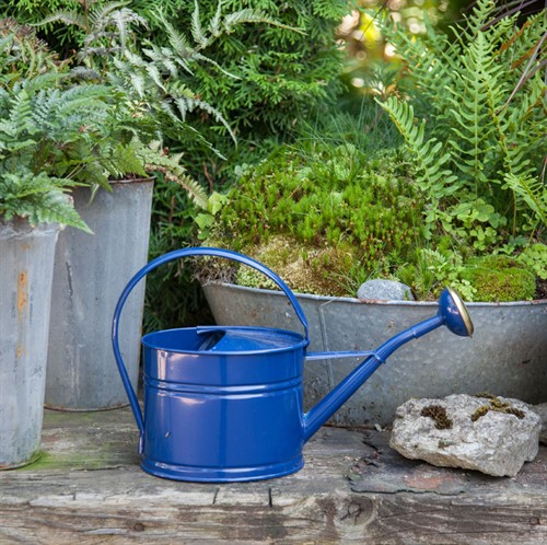 Dekorativ blå oval vattenkanna i lackad plåt från GardenMind. Stril medföljer. Rymmer 1,7 liter. En perfekt stolek för växterna inomhus, om man tar av strilen, och för balkongen.