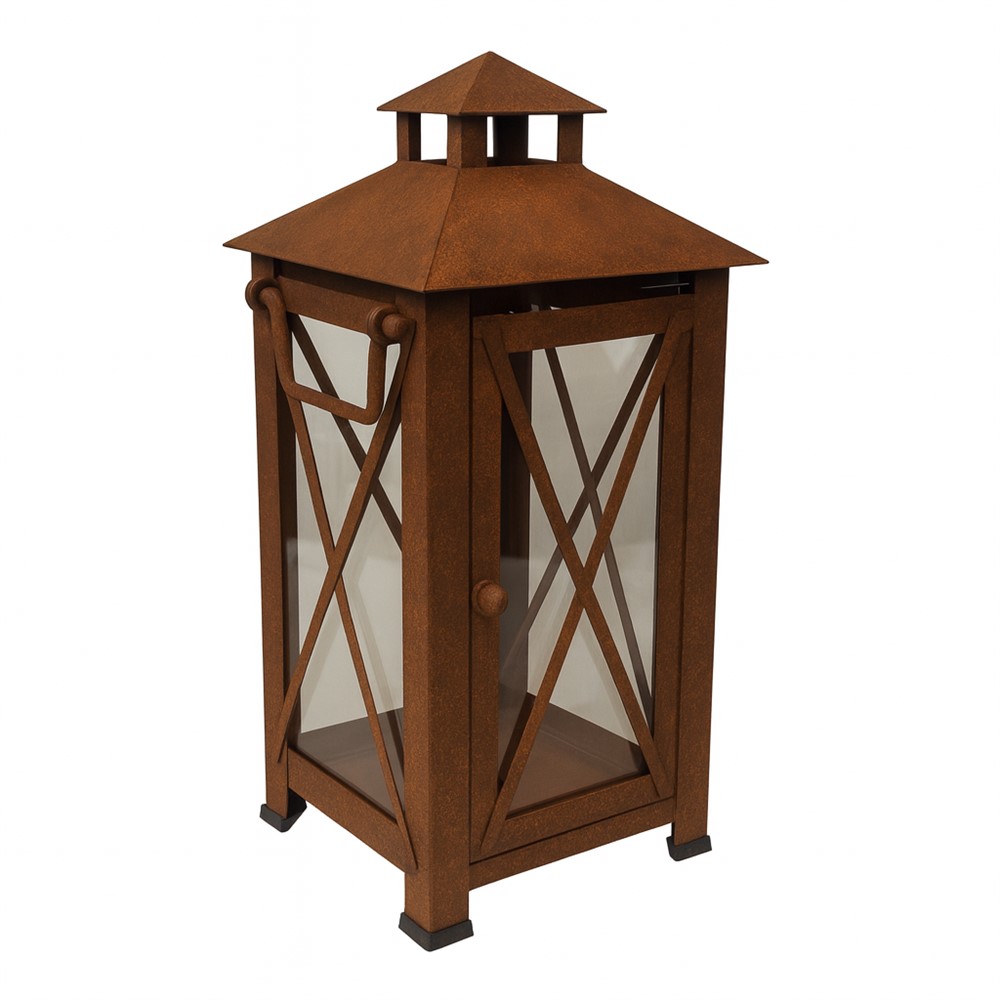 Stilfull lanterna i metall med magnetlås, 25,5×25,5×H54 cm. Finns i både lackerad och rostig modell. De lackerade varianterna har epoxylack för väderskydd och lång hållbarhet, medan den rostiga har en naturlig patina som åldras vackert. En exklusiv och tidlös ljuslykta som skapar stämning både inne och ute.